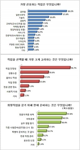 성별로는 남성의 경우 ‘공무원(22.7%)’, ‘기술직(16.1%)’, ‘일반사무직(14.2%)’순으로 선호도가 높았으며, 여성은 ‘일반사무직(22.9%)’, ‘공무원(16.3%)’, ‘교육직(11.3%)’을 선호했다.