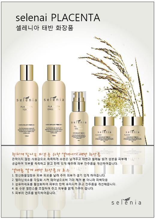 셀레늄화장품 외에도(중에서도) 미백기능이 탁월한 것으로 알려진 셀레니아의 태반화장품은 끈적이지 않는 사용감으로 수분은 촉촉하게 남겨주고 태반과 셀레늄 쌀겨 성분을 피부에 공급해 피부를 맑고 탄력 있게 해주며, 피부잔주름을 개선하는 기능까지 더해 여성들에게큰 인기를 얻고 있다.