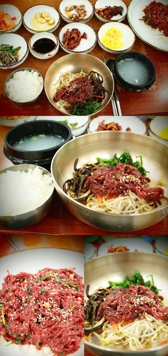 ▲ 예천 ‘백수식당’ 육회비빔밥은 파, 마늘, 깨소금, 참기름, 설탕, 후추 등 으로 골고루 무친 후 간방으로 비벼먹는 것이 특징이다. |