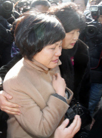 ▲ 박연차 게이트에 연루된 이광재 강원도지사가 대법원 상고심에서 유죄를 확정받은 27일 서울 서초구 대법원에서 판결을 지켜본 이광재 도지사의 부인 이정숙씨가 관계자들의 도움을 받으며 법정을 떠나고 있다. |