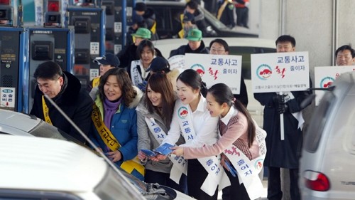 ▲ 한국도로공사는 전국 톨게이트에 근무하는 수납직원 가운데 장애인 비율을 26퍼센트까지 끌어올릴 계획이다. 사진은 도로공사 직원들이 설 귀향길 차량을 대상으로 교통사고 줄이기 캠페인을 벌이는 모습. |
