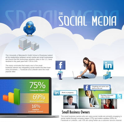 커뮤니케이션과 판촉 전문 기업인 Burson-Marsteller가 조사한 바에 따르면 포춘 글로벌 100대 기업의 80% 가량이 적어도 소셜 미디어 플랫폼의 하나를 기업경영에 활용하고 있고, 65%는 살아있는 트위터 계정을, 54%는 페이스북 팬 페이지를, 50%는 유투브 비디오 채널을, 33%는 기업 자체 블로그를 보유하고 있는 것으로 나타났다.