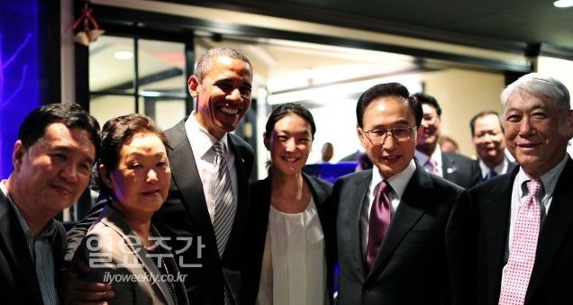 ▲ 이명박 대통령과 오바마 美대통령이 12일 오후(현지시간) 미 워싱턴 버지니아 타이슨즈 코너에 있는 한식당 우래옥에서 만찬을 가진 후 식당 가족들과 기념촬영하고 있다. <사진출처=청와대> |