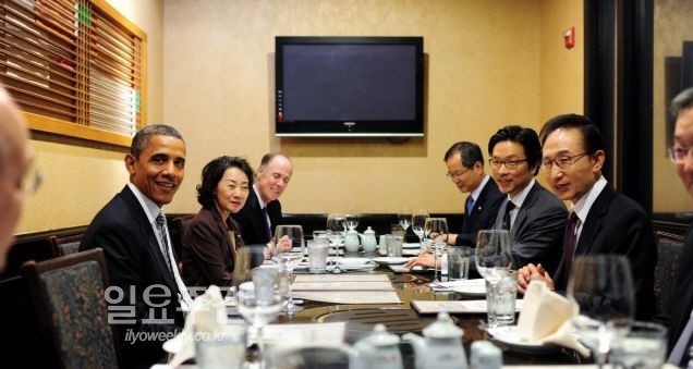 ▲ 이명박 대통령과 오바마 美대통령이 12일 오후(현지시간) 미 워싱턴 버지니아 타이슨즈 코너에 있는 한식당 우래옥에서 얘기를 나누며 만찬을 갖고 있다. <사진출처=청와대> |