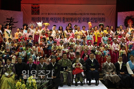 [일요주간=박지영 기자]지난 6일 서울어린이회관에서 제1회 한복어린이 홍보대사 및 모델 선발대회가 열렸다. 이 대회에 2011 월드미스유니버시티(세계대학생평화봉사사절단), 62개국의 후보들도 참석했다. 후보들은 각 나라의 전통의상을 입고 퍼레이드를 하고 사진을 찍는 등 대회에 참가한 어린이들과 즐거운 시간을 보냈다.