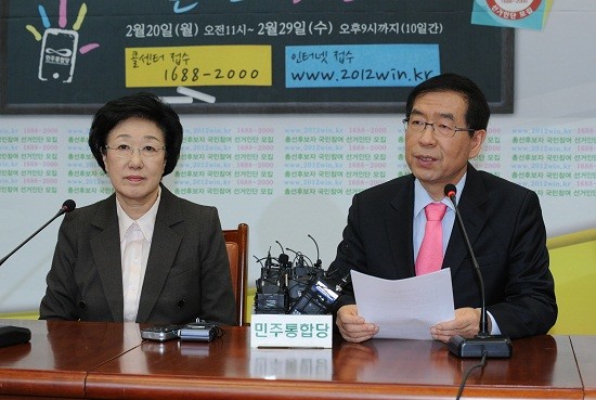 [일요주간=노정금 기자] 박원순 서울시장이 23일 민주통합당 입당식을 갖었다.
