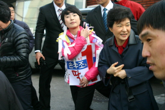 [일요주간=윤영석 기자] 새누리당 박근혜 비상대책위원장이 '문재인 대항마' 손수조 후보을 적극 지원하기 위해서 지난 13일 오후 부산 사상구 손수조 후보 선거사무소에 방문했다.