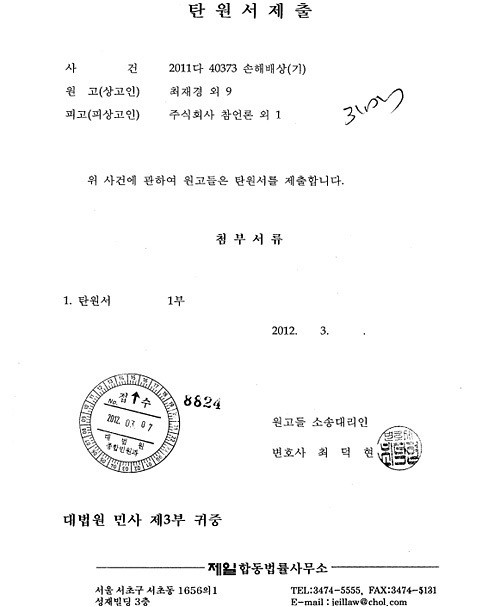 BBK 검사들이 제출한 탄원서에는 사건번호와 함께 ‘원고(상고인) 최재경 외 9’, ‘피고(피상고인) 주식회사 참언론 외 1’ 그리고 이 사건 재판부인 ‘대법원 민사 제3부 귀중’이라고 적혀 있다. 지난 3월 7일 대법원 종합민원과로 접수된 것으로 도장이 찍혀 있으며 원고들 소송대리인인 제일합동법률사무소 최덕현 변호사가 제출했다.