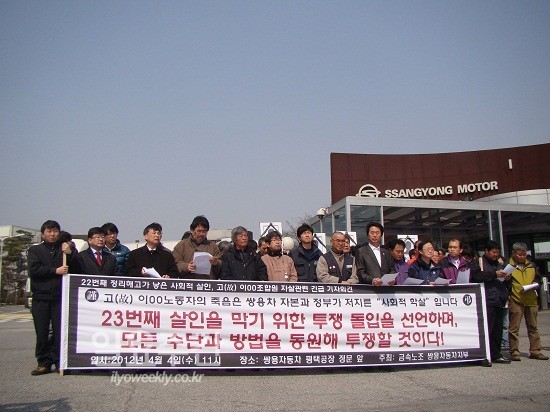 이 조합원은 쌍용자동차에 15년 동안 성실히 일해 왔으며 정리해고 후 취업을 위해 많은 면접을 보았지만 쌍용차 정리해고자가 취업하기 힘든 상황에서 그는 자신의 삶을 비관하면서 23층 아파트에서 투신자살 한 것으로 알려진다.