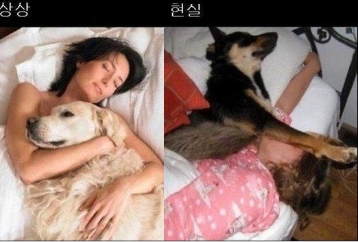 공개된 사진 속에는 개랑 같이 잠을 잘 때 벌어지는 일들의 상상과 현실 두 가지 모습이 담겨있다.