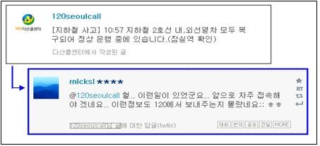 서울시 안준호 시민소통기획관은 “궁금하거나 불편한 일이 있을 때는 120다산콜센터로 시민들의 전화가 쏟아지기 때문에 상담내용에는 시민들의 생활상이 고스란히 담겨져 있다고 해도 과언이 아니다”라며 “이에 따라 120다산콜센터 문의가 많은 상담에 대해서는 한발 앞서 트위터 팔로워와 미투데이 친구에게 정보를 제공하고 있다”고 말했다.