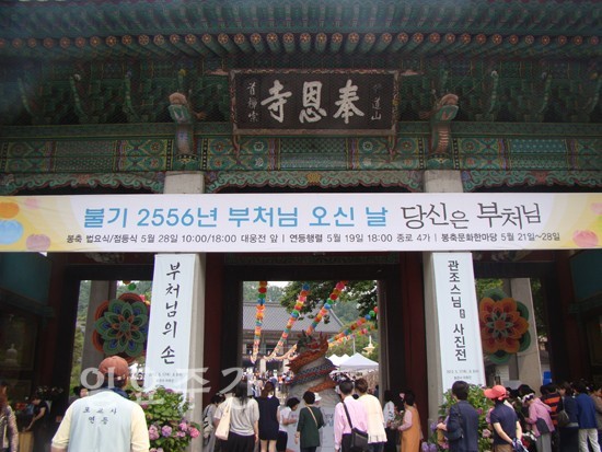 [일요주간=노정금 기자] 오늘(28일) 불기 2556년 부처님오신날을 맞아 수도산 봉오리에 자리 잡은 봉은사에서 부처님의 탄신을 축하하는 봉축행사가 행해졌다.
