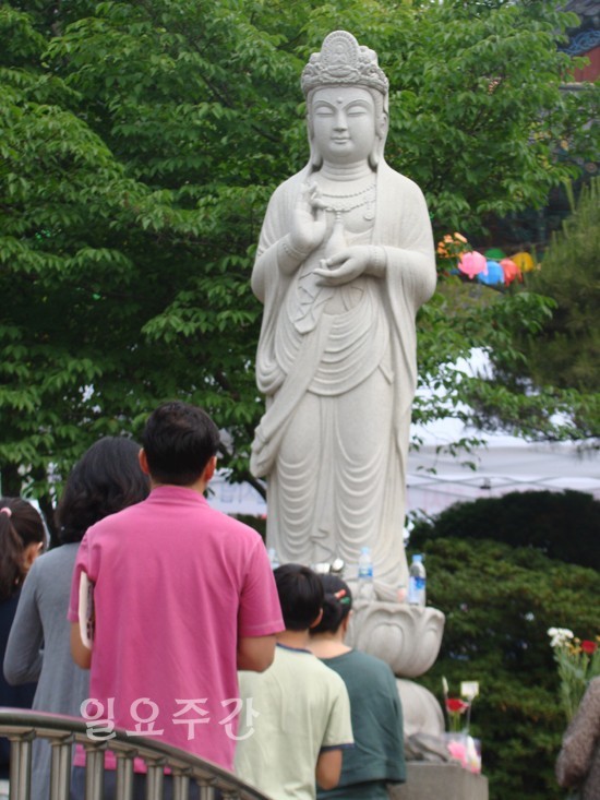 ▲ 봉은사 대웅전 아래 위치한 '해수관음상'에서 불자들이 기도를 하고 있다. ▶사진=노정금 기자 |