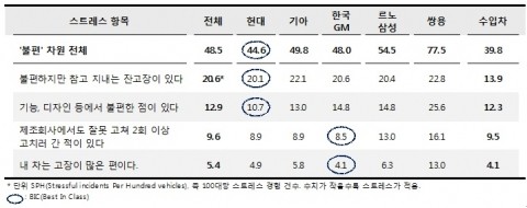 ‘불편’부문 품질스트레스의 세부항목별에서도 ‘잔고장’과 ‘불편한 기능ㆍ디자인’으로 인한 스트레스가 가장 적은 회사는 현대차였다. ‘재수리’로 인한 스트레스가 가장 적은 회사는 한국GM이 선정됐다.