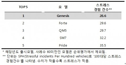 현대차 제네시스는 평균 28.6건에 선정, ‘불편부문 품질스트레스가 가장 적은 차 1위’에 등극했고 그 뒤를 기아차의 포르테(29.6건)와 르노삼성차의 QM5(29.7건),SM7(32.2건)가 이었다.기아차의 프라이드(35,5건)는 톱5에 마지막으로 이름을 올렸다.