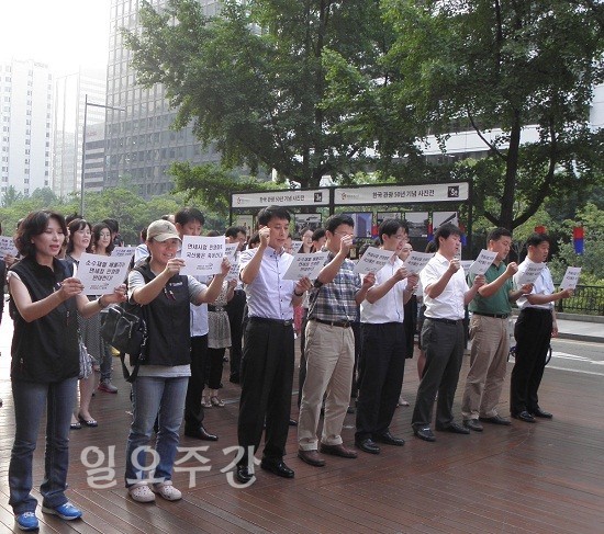 ▲ 한국관광공사 노동조합원들이 MB특혜, 재벌특혜 공기업 민영화 반대시위를 하고 있다. ▶사진=노정금 기자 |