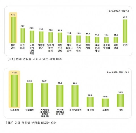 이어 “지속되는 경기 불황으로 실질임금이 감소하고 있는 현 상황에서, 가계 경제에 큰 부담으로 작용하고 있는 생활 물가를 안정화 하기 위한 노력이 지속돼 특히 향후 정책의 방향을 결정함에 있어 국민들이 최대의 사회적 관심사로 물가 안정을 꼽은 사실에 주목해야 할 것이다”고 분석했다.