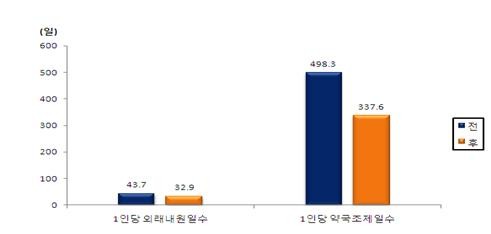 또 의료급여 환자의 의약품 중복투약 관리 제도 시행 전ㆍ후를 비교한 결과 중복투약자의 진료비와 의료이용 일수가 1인당 약국진료비가 139만 8천원에서 100만 7천원으로 감소한 했으며 1인당 약국조제일수는 498일에서 337일로 줄었다.