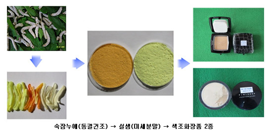 이번에 개발한 색조화장품은 파우더(powder)와 투웨이케익(two way cake) 2가지로, 냉동 건조한 누에에서 실샘을 모아서 원심식 초미세분말 제조기에 넣고 미세분말(입자크기: 10∼20㎛)로 만든 다음, 이 미세분말을 원료로 사용해 만든 것이다.