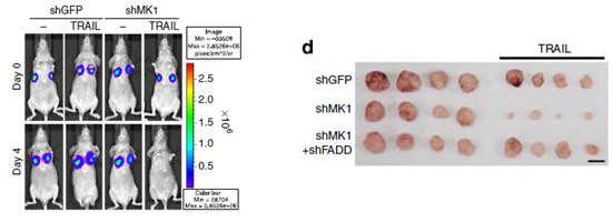 또한 연구팀은 유방암과 자궁암 세포주*에서 MKRN1의 기능을 억제하면 FADD 단백질의 양이 증가하여, FADD 단백질이 많은 세포주에 약물(TRAIL)로 항암치료를 하면 종양이 더욱 빠르게 감소하는 등 치료효과가 크게 증가한다는 사실을 동물실험(생쥐)을 통해 검증했다.