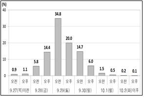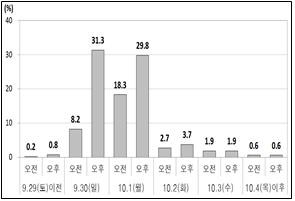 출발일과 시간대별 분포도를 보면 귀성 시에는 추석 하루 전인 29일(토) 오전에 출발하겠다고 응답한 비율이 34.8%로 가장 많고, 귀경 시에는 추석 당일 오후에 출발하겠다는 응답이 31.3%로 가장 많았다. 추석 다음날인 10월 1일(월) 오후 출발도 29.8%로 나타나 추석 당일부터 월요일까지 귀경교통량이 다소 집중되고 이후 수요일까지 분산될 것으로 예상된다.