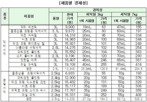 다만 물빠짐과 이염방지에서 가격대비 분말세제보다 액체세제가 우수한 만큼 오염도가 심하지 않은 경우 액체세제를 사용하는 것이 경제적이라고 귀뜸했다.