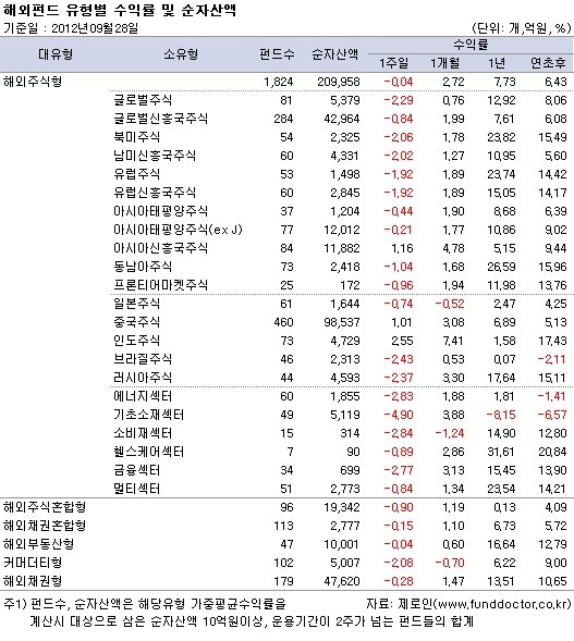 펀드평가사 제로인 강영민 펀드애널리스트는 9월 28일 아침 공시된 기준가격으로 펀드수익률을 조사한 자료를 발표하고 해외주식형펀드는 한 주간 -0.04%의 수익률을 기록했다고 밝혔다.