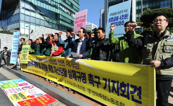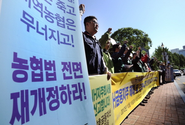 이날 전국농협노동조합 민경신 위원장은 회견문을 통해 "정부와 농협중앙회는 농협 해체 법률인 지주회사분리 농협법 개정안을 국회에서 통과시키고 이를 시행하기 위해 농민조합원과 지역 농·축협 자산인 상호금융자산을 지주회사 분리에 따른 부족자본금으로 사용하는 등 만행을 저지르고 있다"고 주장했다.