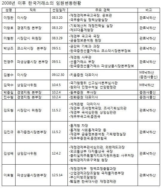 정 의원은 김봉수 현 이사장은 물론 업무와 관련없는 인사라는 지적을 받아온 김덕수 전 상임감사 등의 인사를 지적하며 "이들이 대표적인 MB정권의 수혜자"라고 지적했다. 거래소 임원 자리를 놓고 MB측근 깔기로 전락했다는 설명이다.