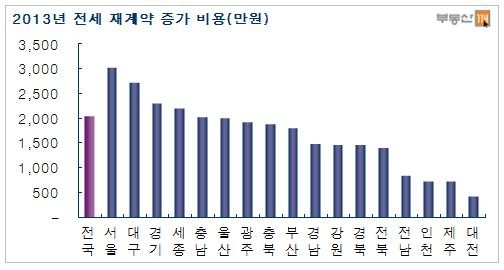 서울을 제외한 수도권 지역에선 경기 2302만원, 인천 713만원 정도의 재계약 비용이 필요한 것으로 파악됐다. 이와함께 지방에서는 충청과 영남 지역의 재계약 비용이 많은 것으로 집계됐다. 대구는 2723만원으로 전국에서 서울 다음 두 번째로 재계약 비용이 높았다.