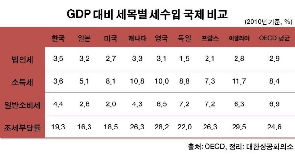 보고서에 따르면 2010년 기준 우리나라 GDP 대비 법인세수 비중은 3.5%로 노르웨이,룩셈부르크, 호주, 뉴질랜드, 스웨덴에 이어 OECD 34개국 중 6번째로 높은 수준이다.