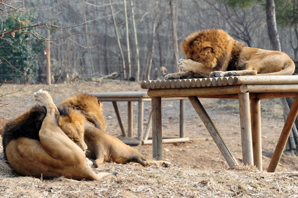 이날 경기도 과천 서울대공원 내 동물원에서 사자들이 따스한 햇살에 놀라 기지개를 펴며 졸린 표정을 짓고 있다.