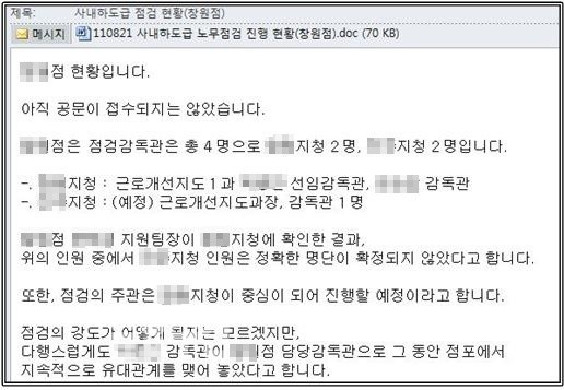 실제 이마트 한 직원은 내부 메일을 통해 “감독관과 어느 정도 유대관계가 형성돼 있다”, “시청, 노동부, 경찰서, 기자 등에게 수박을 전달할 계획이다”는 등의 내용을 주고받은 것으로 드러나 이마트 담당 지청을 관리해온 것이 나타났다.