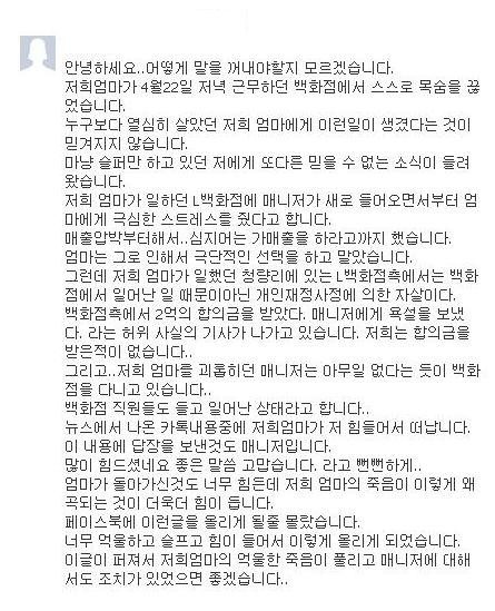 숨진 A씨의 딸 B(22)씨는 자신의 페이스북을 통해 “롯데백화점에 새로 매니저가 들어오면서 엄마에게 극심한 스트레스를 줬다”고 주장했다.