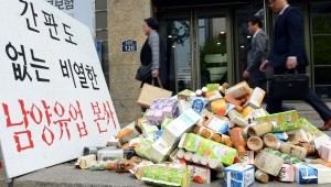 | 남양유업 대리점 피해자협의회 회원들이 남양유업 불매운동을 위해 본사 앞에 쌓아놓은 유제품들. @Newsis | ||