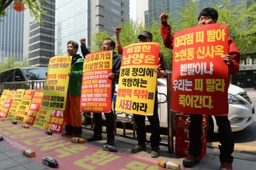 | 6일 오전 서울 중구 남대문로 남양유업 본사 앞에서 남양유업 대리점 피해자협의회 회원들이 구호를 외치고 있다.@Newsis | ||