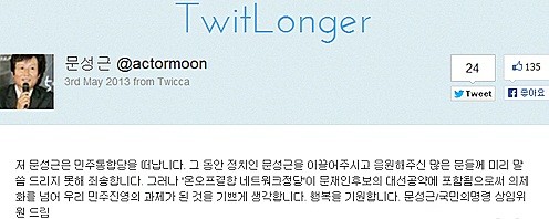 탈당을 결심한 이유와 관련해서는 "(전당대회 전 일련의 과정이) 저로서는 통합정신에 위배된다, 대선공약에 어긋난다는 것을 역사적으로 기록에 남길 필요가 있었다. 저는 민주통합당 당원"이라고 선언했다.