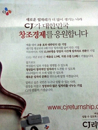 실제 CJ는 정규직 전환에 대한 광고를 주요 일간지에 게재하면서 “대한민국 창조경제를 응원한다”며 박근혜 정부의 정책을 지지했다.