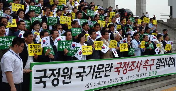 [일요주간=문경원 기자] 민주당이 국정원 대선개입 · 서해북방경계선(NLL)포기 발언 논란을 다시 꺼내들어 여야 갈등이 고조되는 가운데 21일 오전 여의도 국회 본청 앞에서 민주당 김한길 대표를 비롯한 당 소속 의원과 당직자들이 ‘국정원 국기문란 국정조사’를 촉구하는 결의대회를 열었다.