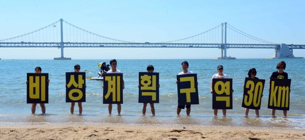 부산 광안대교 케이블 위에서 원전반대 고공시위를 사흘째 벌이고 있는 국제환경단체 그린피스 활동가들과 뜻을 같이하는 반핵부산시민대책위원회 활동가들이 11일 오전 광안리 해수욕장에서 피켓시위를 벌이고 있다.