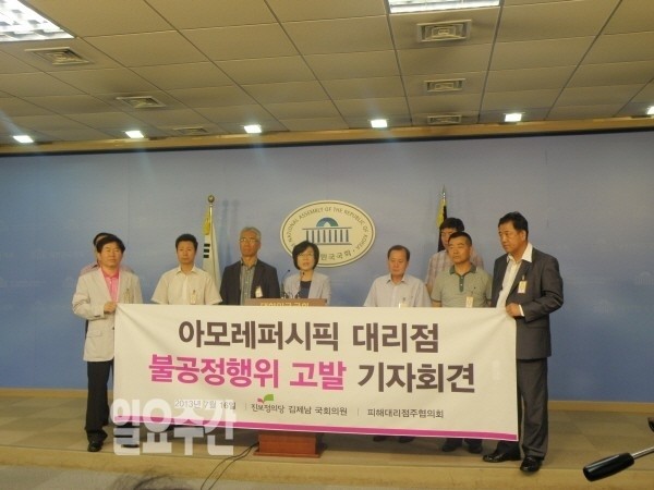 김 의원 및 피해대리점주협의회에 따르면 국내 화장품업계 1위이자 시장점유율 39%를 차지하는 아모레퍼시픽은 그간 특약점과 같은 판매조직을 통해 시장개척의 위험과 비용을 줄이고 안정적인 영업구역을 확보하면서도 상품공급의 독점성, 구매 및 판매전산시스템, 판매목표 및 장려금 등 불공정거래행위를 저질러왔다.