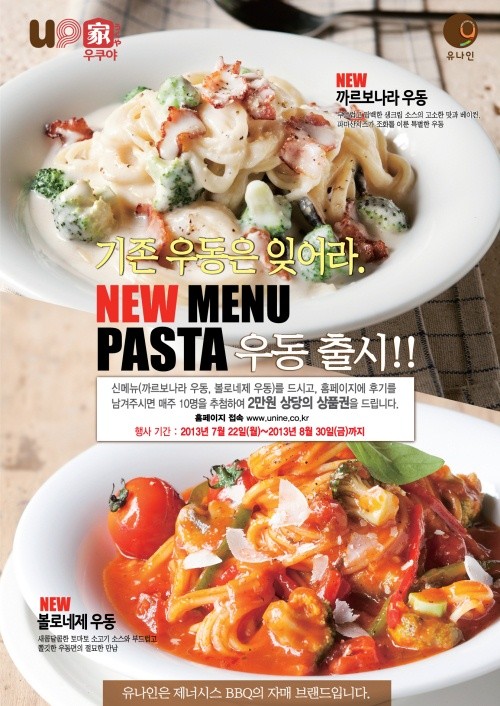 이번 우쿠야에서 야심차게 선보이는 메뉴는 ‘까르보나라 우동’ 과 ‘볼로네제 우동’으로 기존의 파스타에 우동면발을 도입한 신개념 메뉴이다.