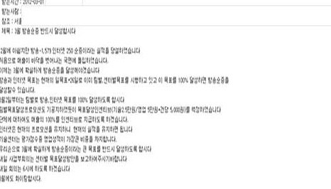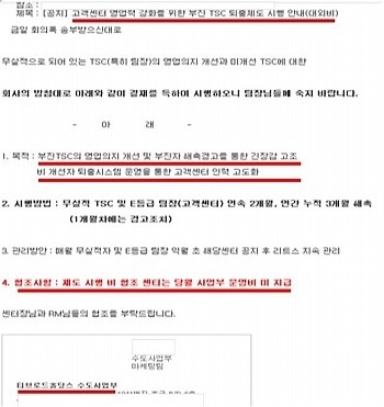 본사는 또 최근 센터에 보내는 메일을 통해 “3월 2일부터는 팀별로 방송 인터넷 목표를 100% 달성하자”며 “목표달성인센티브를 책정했고 단체에 대해서도 매출 외 100%를 지급하도록 하겠다”며 협력업체 직원들을 대상으로 실적목표제를 운영했다.