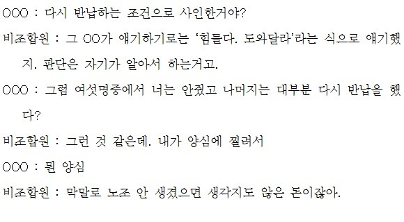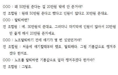 금품으로 노조탈퇴를 종용하려한 정황도 확인됐다. 공개된 녹취록에서 전 조합원은 한 직원과의 대화에서 “노조를 탈퇴하면 기름값을 챙겨주겠다고 했다. 그래서 20만원을 받았다”고 말해 노조가입을 방해하려한 사실이 드러났다.
