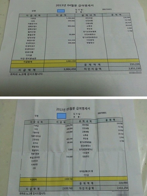 하지만 5월 급여명세서는 기본급과 식대, 기술수당, 기술인센티브, 고정연장, 유치비, 평일연장, 평일당직, 차량지원급, 휴일근무수당, 인센티브, 지연수당 및 기타라고 지급내역이 다소 줄어들어 표기됐으며, 기본급은 102만1700원으로 지난달에 비해 40만원 상당 차이가 난다.