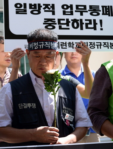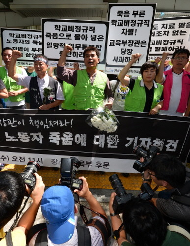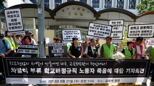 공공운수노조 전회련학교비정규직 본부(이하 전회련 본부)는 지난 17일 충북지역의 학교비정규직노동자가 자신이 근무하던 학교에서 자살한 사건과 관련해 21일 오전 세종로 정부서울청사(교육부) 후문 앞에서 ‘차별이 부른 학교비정규직 노동자 죽음'과 관련해 긴급 기자회견을 열었다.