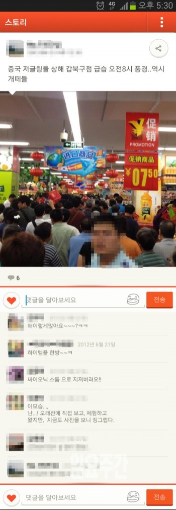 A씨가 공개한 자료에 따르면 파트장인 B씨는 카카오스토리를 통해 중국 롯데마트에 모인 중국인들의 모습을 촬영해 올리며 “중국 저글링등 상해 갑북구점 급습 오전 8시 풍경..역시 개떼들”이라고 사진을 설명했다.