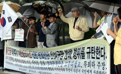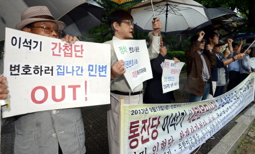 비젼21국민희망연대, 라이트코리아 등 시민단체 회원들은 이날 서울 서초구 중앙지법 앞에서 민변 소속 20여명의 변호인단이 이 의원 등이 연루된 내란음모 사건을 국정원의 조작 사건인양 물타기 하고 있다며 강하게 비난했다.