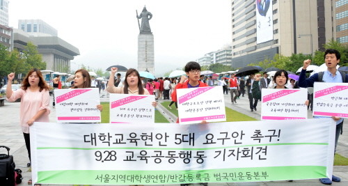 이날 오전 서울 종로구 세종로 이순신 장군 동상 앞에서 서울지역 대학생연합 대학생들이 참석해 ‘열린 대학교육현안 5대요구안 실현’을 요구했다.