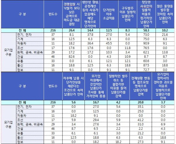상대적으로 피해 수치가 낮았던 자동차 협력사들의 경우 ‘납품단가 후려치기’는 90.9%를 기록했고 건설업종의 경우 경쟁 입찰에도 불구하고 낮은 하도급대급을 받아 피해를 본 것으로 조사됐다.
